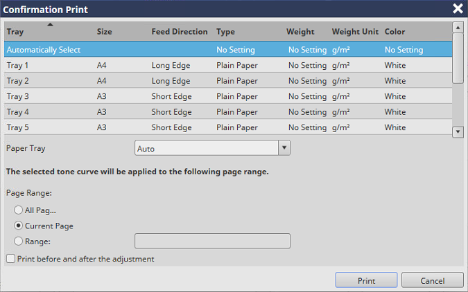 Screen access | AccurioPro Print Manager - Select a job. - [Job Management] - [Tone Curve Adjustment...] - [Confirmation Print...] | |||