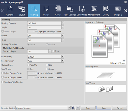 Set the bind direction and output tray, as well as finishing processing such as stapling, punching, and folding.