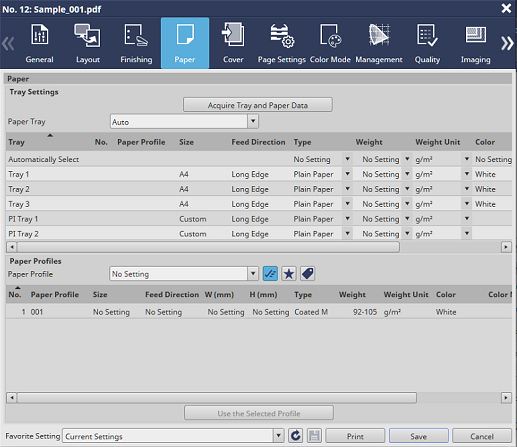 AccurioPro Print Manager - Select a job. - [Job Management] - [Job Settings...] - [Paper]