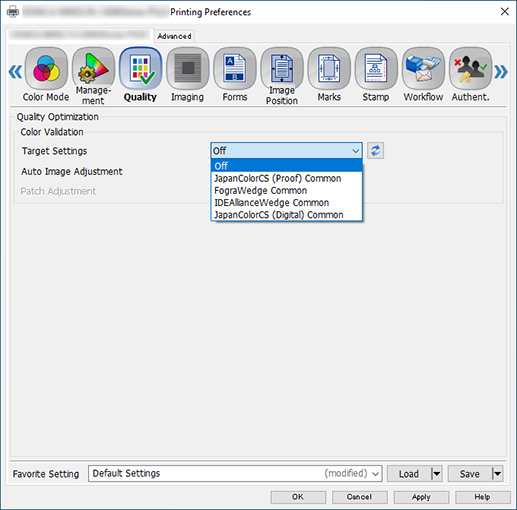 Setting items | [Target Settings] | Select the target setting used for color validation. | ||