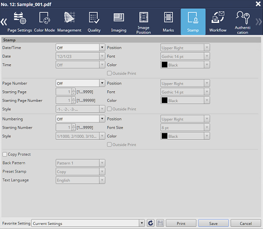AccurioPro Print Manager - Select a job. - [Job Management] - [Job Settings...] - [Stamp]