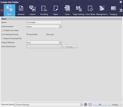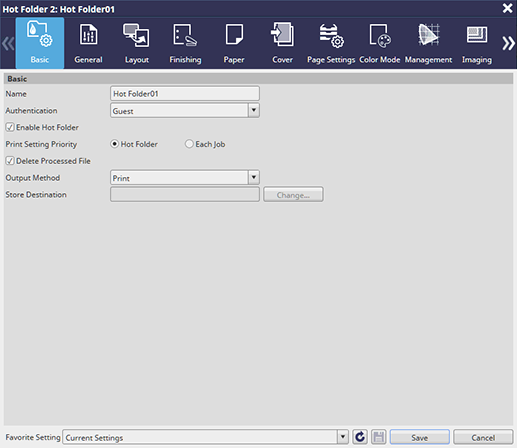 Clicking the tab displays each setting page. For details about the setting, refer to Hot Folder Configuration Screen.