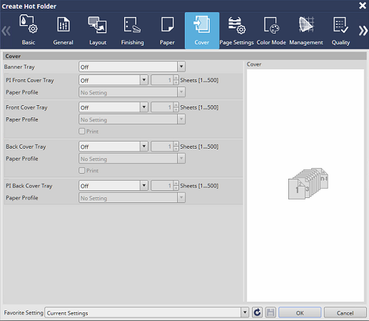 Touch panel - [CNTL] - [Configuration] - [Hot Folder Configuration...] - Right-click a hot folder - [Create...] - [Cover]