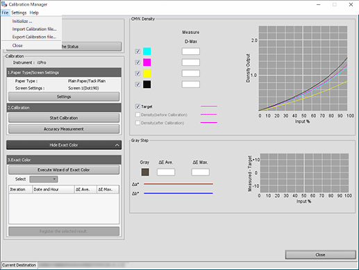 The displayed items vary depending on whether Advanced Calibration mode is set to Exact Color or G7 Calibration in Color Centro.