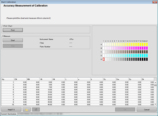 Color charts are printed. When printing is completed, the display returns to the [Accuracy Measurement of Calibration] screen.