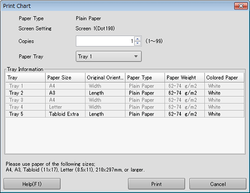 Setting items | [Print] | Print color charts. The printing date and time, the number of output copies, and the sequence number are printed in color charts. | |