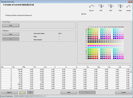 When measurement is completed, a measurement data list is displayed at the bottom of the [1.Create of current table(ExCol)] screen, and patches on the preview are displayed in color.