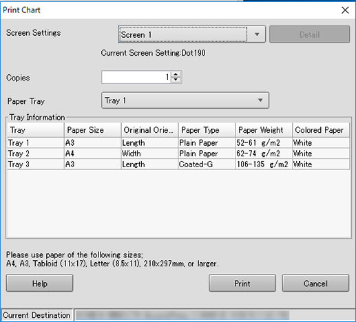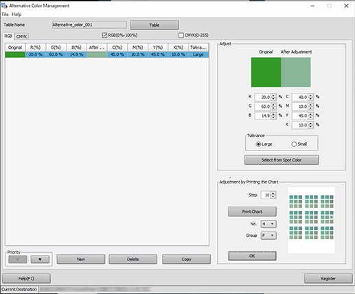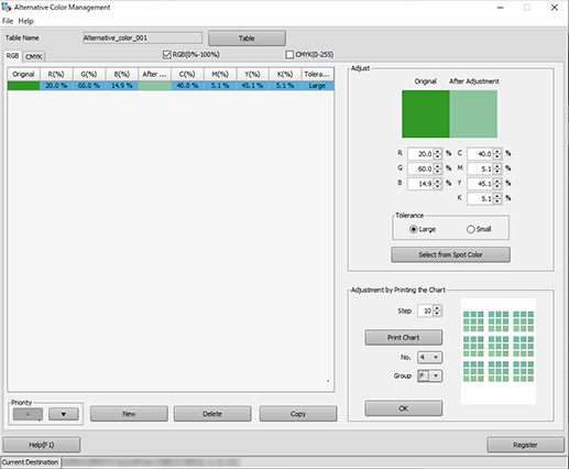 A color chart that is changed in 8 steps depending on the change amount (%) with the CMYK value specified using the current output color as the central value is displayed every 9 groups of which the CMYK change method is different.