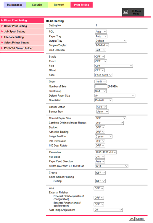 Web Connection - [Print Setting] - [Direct Print Setting] - [Basic Setting]