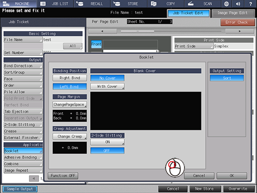 If you press [Booklet] in [Application Setting] the cursor should automatically move to over the pop-up screen.
