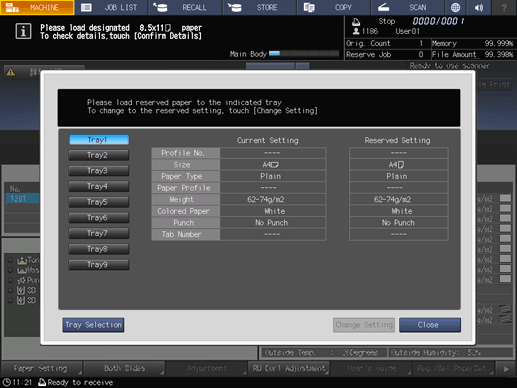 The message [Please load designated ### paper / To check details, touch [Confirm Details]] will be displayed when you try and print if the trays are loaded with paper of a different size than the specified size for printing.