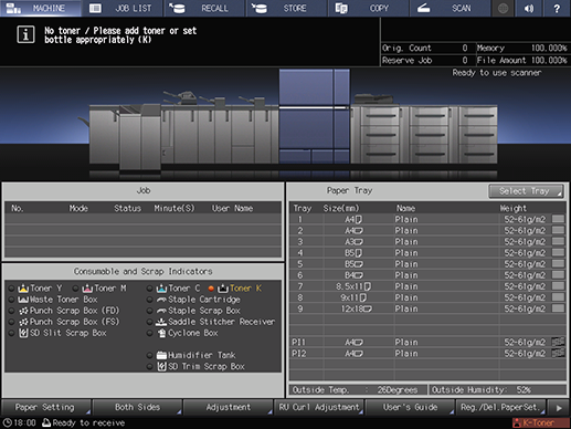 Among the toner color indicators displayed in the [Consumable and Scrap Indicators] display area on the [MACHINE] screen, the color of the toner that has run out lights up red and the text color changes to yellow.