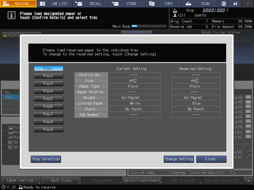The paper settings (current settings) for the selected tray and the paper settings (reserved settings) required by the print data is displayed.