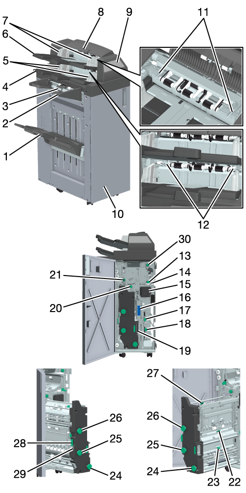 27 | Lever [FD12] | When clearing a paper jam in the folding unit, hold the lever, open the guide, and remove the paper. |