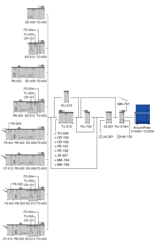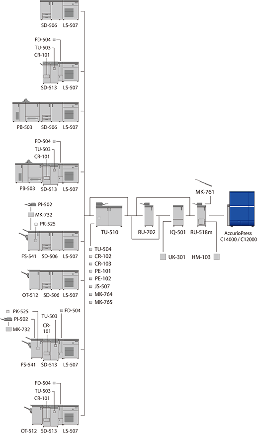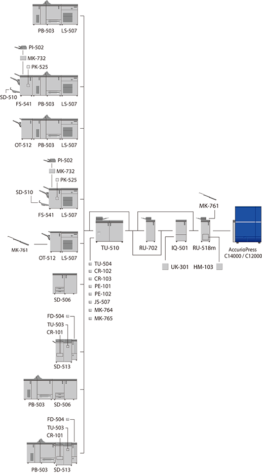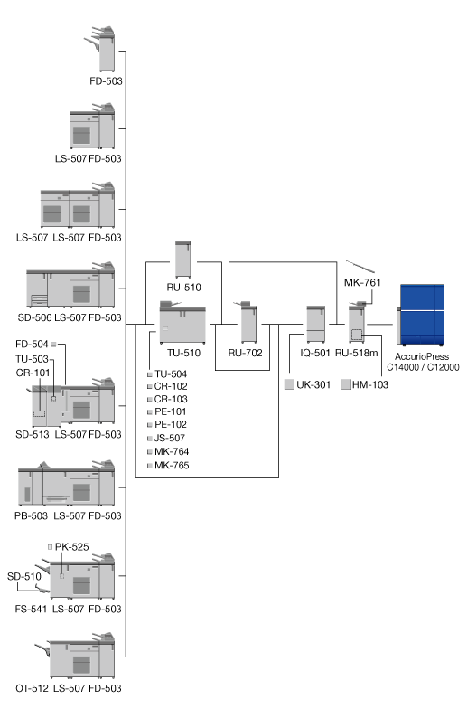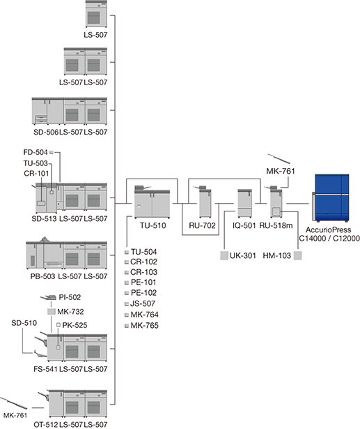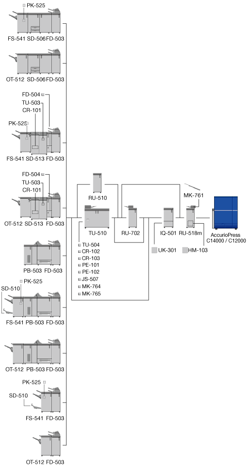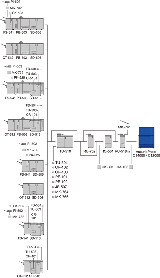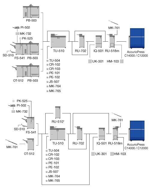The optional devices marked with an asterisk "*" are only required when Finisher FS-541 with PostInserter PI-502 is mounted directly below.