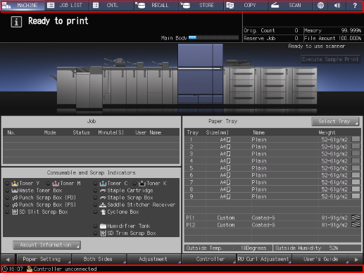 Operate AccurioPro Print Manager from the Touch panel. You can check the status of this system or manage print jobs. | |