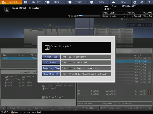 [Stop at a Set]: The job will be stopped at a set end. To restart printing, press Start on the Control panel. [Stop at a Set] is displayed when Image Controller IC-610 is mounted.