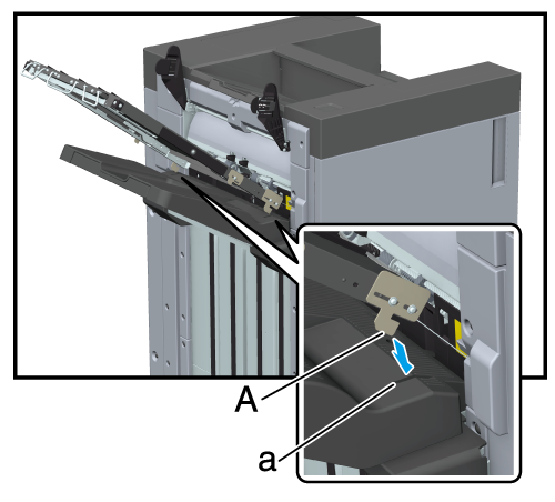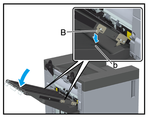 Lower the position of the Main tray when attaching or detaching Banner Output Tray Unit MK-761 to or from the Output Tray OT-512.