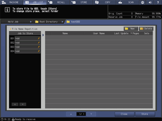 If the file name of the job is duplicated, the confirmation dialog box is displayed. To store the job as it is, press [Yes]; otherwise, press [No].