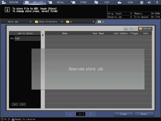 Screen access | Touch panel - [JOB LIST] - [Hold Job] - [HDD Store] | ||