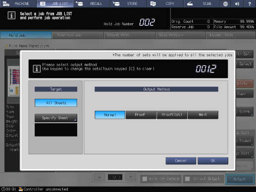 Specify the output method and the number of sets. Print jobs are managed in [Reserved Job].