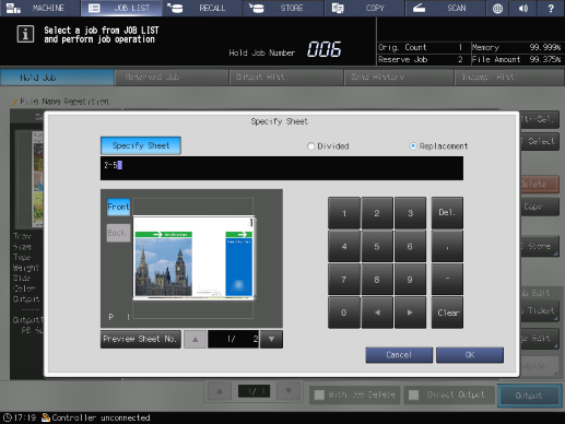Screen access | Touch panel - [JOB LIST] - [Hold Job] - [Output] | ||