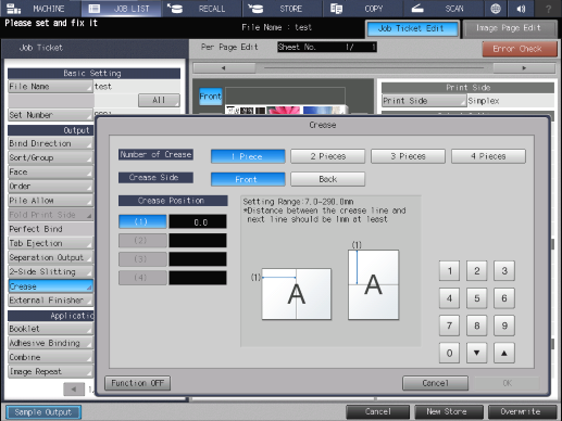 Touch panel - [JOB LIST] - [Hold Job] - [Job Ticket] - [Job Ticket Edit] - [Crease]