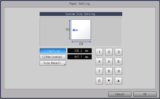 To use the custom size registered in this system, press [Size Recall]. For details, refer to [Custom Size Setting].