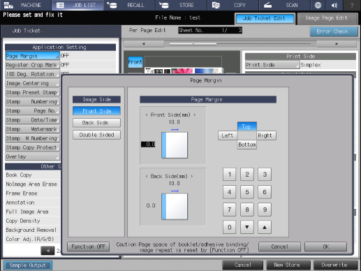 Touch panel - [JOB LIST] - [Hold Job] - [Job Ticket] - [Job Ticket Edit] - [Page Margin]