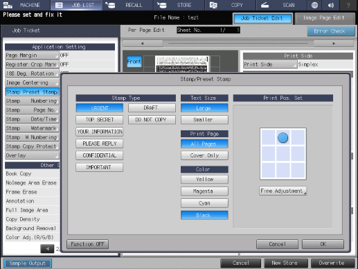 Touch panel - [JOB LIST] - [Hold Job] - [Job Ticket] - [Job Ticket Edit] - [Stamp Preset Stamp]
