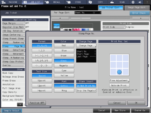Touch panel - [JOB LIST] - [Hold Job] - [Page Edit] - [Job Ticket Edit] - [Stamp Page No.]