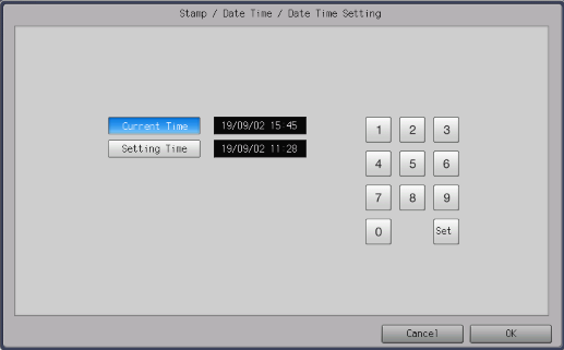 Touch panel - [JOB LIST] - [Hold Job] - [Page Edit] - [Job Ticket Edit] - [Stamp Date/Time] - [Date/Time Set.] | |||