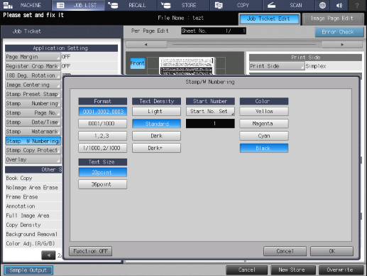 Touch panel - [JOB LIST] - [Hold Job] - [Job Ticket] - [Job Ticket Edit] - [Stamp W Numbering]