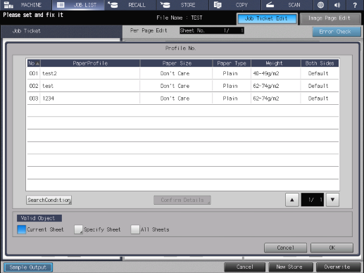 Touch panel - [JOB LIST] - [Hold Job] - [Page Edit] - [Job Ticket Edit] - [Profile No.]