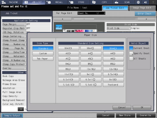 Touch panel - [JOB LIST] - [Hold Job] - [Page Edit] - [Job Ticket Edit] - [Paper Size]