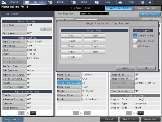 Touch panel - [JOB LIST] - [Hold Job] - [Page Edit] - [Job Ticket Edit] - [Auto Tray Target]
