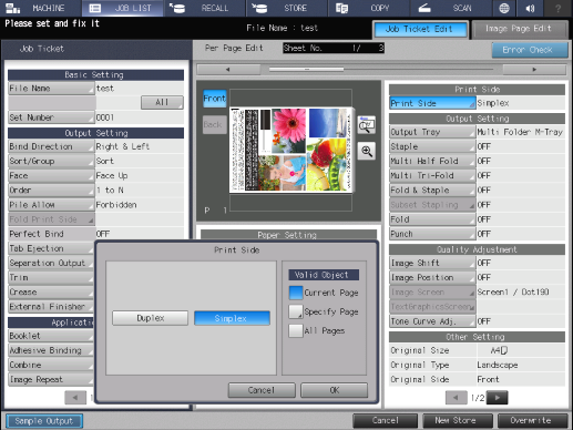 Touch panel - [JOB LIST] - [Hold Job] - [Page Edit] - [Job Ticket Edit] - [Print Side]