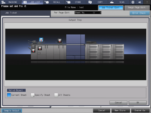 Touch panel - [JOB LIST] - [Hold Job] - [Page Edit] - [Job Ticket Edit] - [Output Tray]