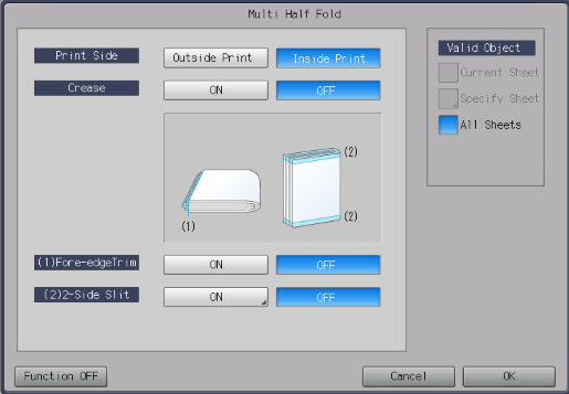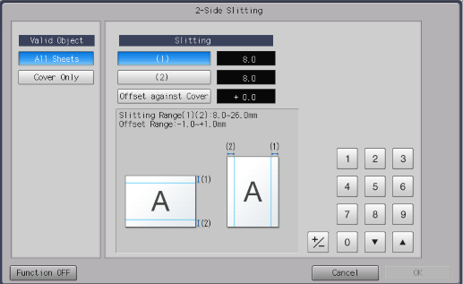 Setting items | [ON] | Slits both edges of the paper. [Slitting] and [Offset against Cover] are available. | |