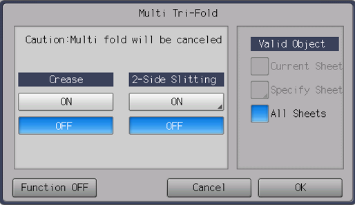Setting items | [ON] | Slits both edges of the paper. [Slitting] and [Offset against Cover] are available. | |