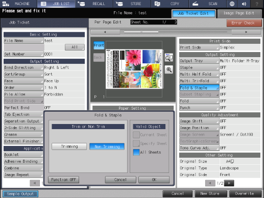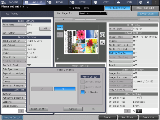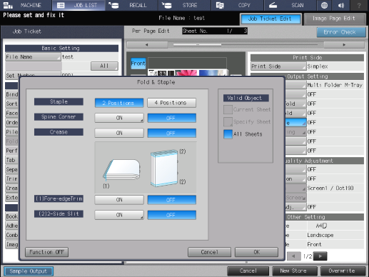 Touch panel - [JOB LIST] - [Hold Job] - [Job Ticket] - [Job Ticket Edit] - [Fold & Staple]