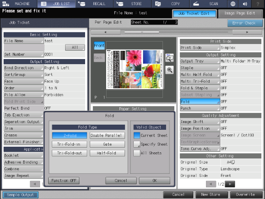 Touch panel - [JOB LIST] - [Hold Job] - [Page Edit] - [Job Ticket Edit] - [Fold]