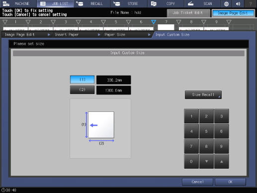 Touch panel - [JOB LIST] - [Hold Job] - [Page Edit] - [Image Page Edit] - [Insert Paper] - [Change] - [Paper Size] | ||||