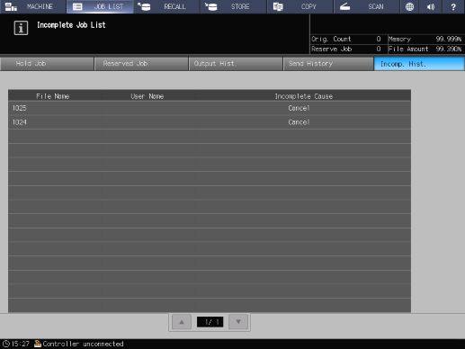 Touch panel - [JOB LIST] - [Incomp. Hist.]