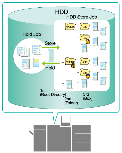 - Hold jobs and HDD store jobs are stored in different areas on the machine’s HDD. Hold jobs are not displayed on the [RECALL] screen. For details about differences between hold jobs and HDD store jobs, refer to What Is a [STORE]?.