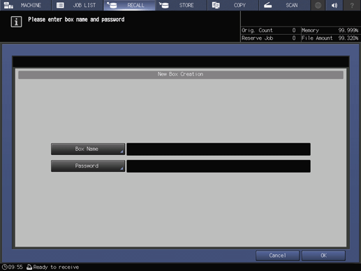 Screen access | Touch panel - [RECALL] - Select a folder to create a box - [New] | ||