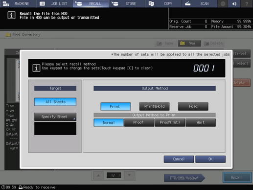 Touch panel - [RECALL] - Select an HDD store job - [Recall]