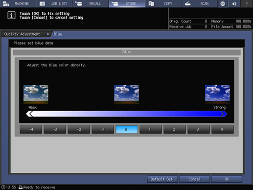 Set the level of blue (B). Adjust the blue level when the scanned image is reproduced in deep blue or light blue.