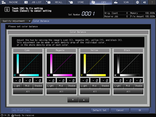 Touch panel - [COPY] - [Quality Adj.] - [Color Balance]