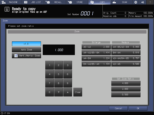 This function can be used properly by setting the zoom ratio with numeric values, automatically zooming in or out according to the document size and the paper size of the selected paper tray, or selecting from pre-registered zoom ratios, etc.